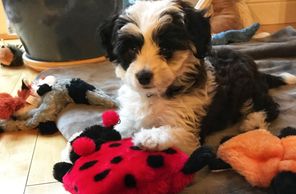 Thank you so much for everything you did to ensure the perfect addition to our home. Puddin' is little in stature but huge in personality! She is crazy smart, loves to play fetch and does not shed. I LOVE how if she gets muddy, it practically falls off her and she is clean again after a short time. Her coat does not require a ton of upkeep but she is a bit of a diva and loves the attention of a bath & brush.